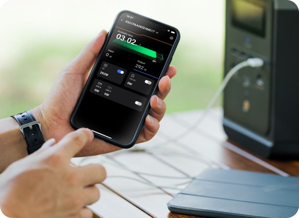 Get all the same info about battery percent, remaining recharge time, hours left, and more on the built-in screen. You can check the battery's status anywhere from the EcoFlow app.