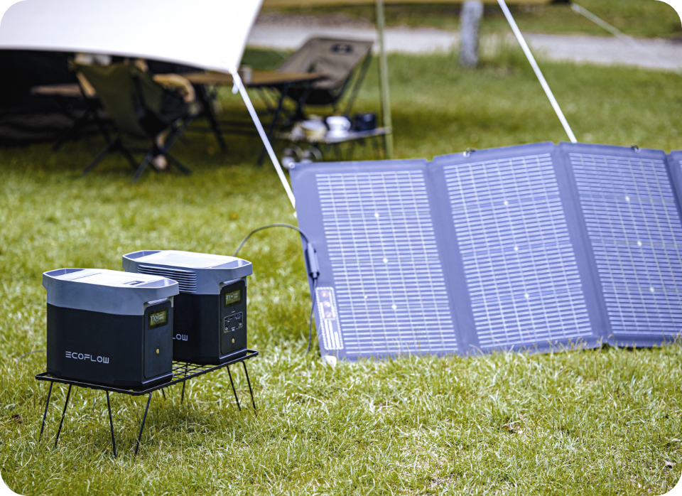 DELTA 2 and its Extra Battery charge and discharge in unison. Recharging from portable solar panels, AC outlets, or our Smart Generator is easy.