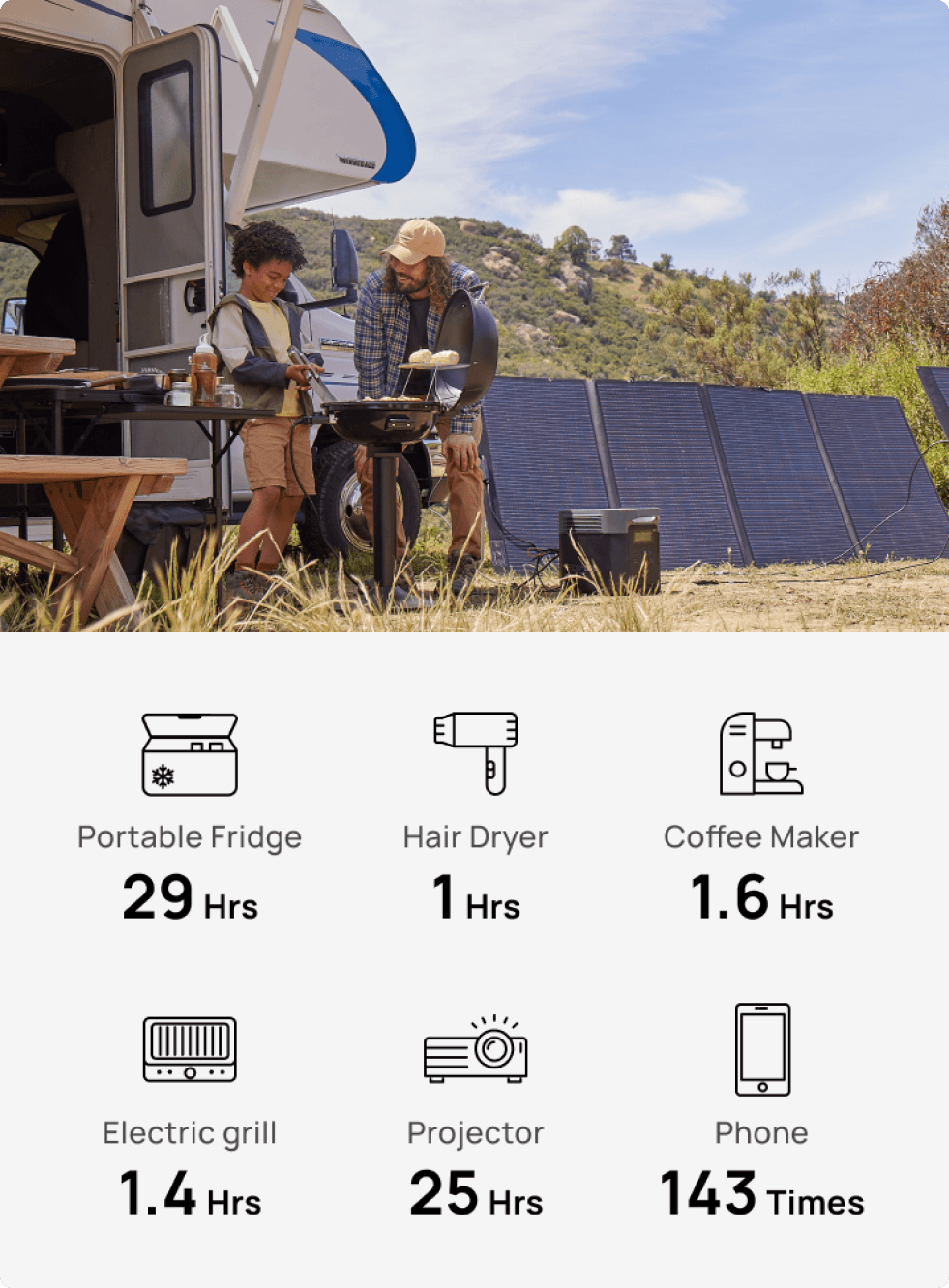 With DELTA 2 Max's upgraded tech, combine up to 1000W solar input with AC for world-leading charging speeds. In only 43 min get an 80% charge. Or stick with AC for an 80% charge in a speedy 1.1 hour.