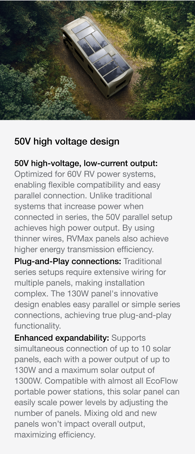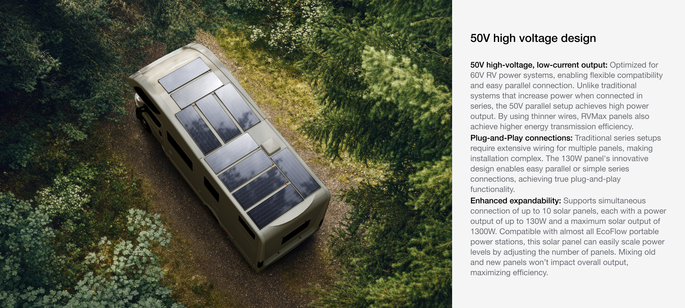 EcoFlow 130W RVMax Rigid Solar Panel features an innovative modular design, delivering up to 130W power, 50V, and 3A current output, and connects up to 10 panels within a safe range. Works seamlessly with various power stations.