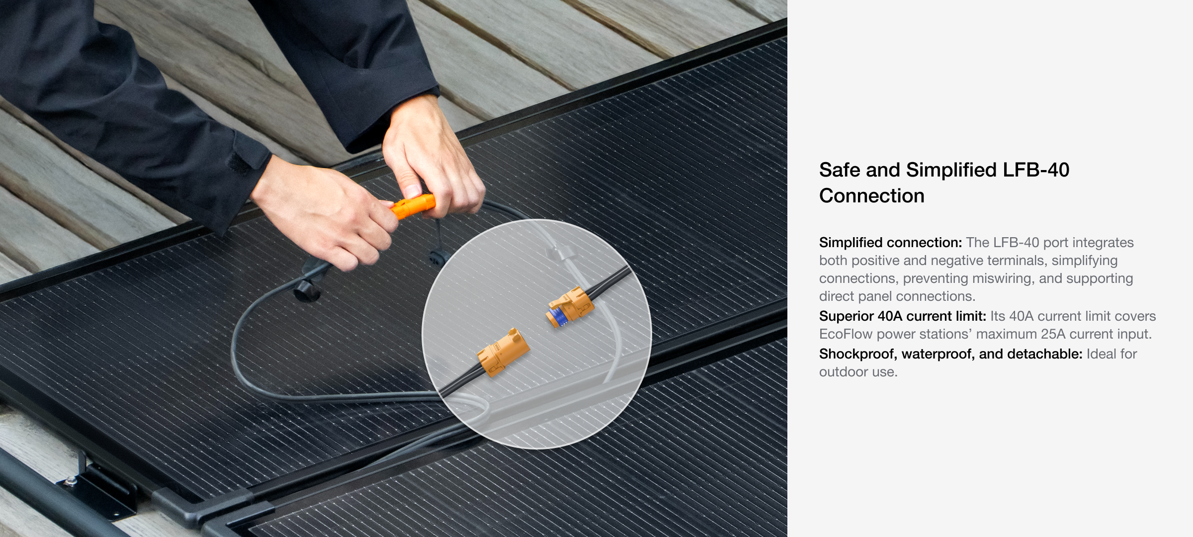 The LFB-40 interface is a common DC power output connector used for solar panels. It primarily facilitates power transmission between portable solar power generation equipment and devices like charging controllers, energy storage units, and power banks.