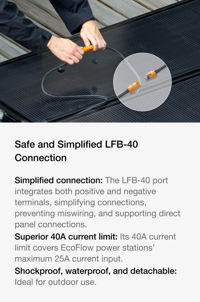 Easily connect to third-party solar systems using the included photovoltaic connector (MC4 compatible)⁴. Safely charge your power systems and portable power stations with XT60 connectors, featuring waterproof, anti-leak technology that's touch-safe and reliable.