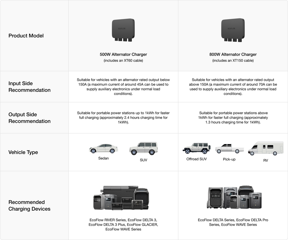 third-party power stations. The charger's 500W fast-charging is compatible with most SUV, Pickup, and RV alternators, meeting diverse short-trip car camping power needs.