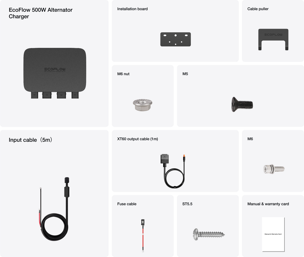 ²For the installation of the Alternator Charger, please refer to the video or illustrated installation guide provided by EcoFlow. We recommend that the wiring process be completed by a professional. Before use, please review the installation video or illustrations to ensure correct usage after full understanding. Incorrect operation of this product could result in injury or product damage and property loss. By using this product, you are deemed to have understood, acknowledged, and accepted all terms and content of this document. EcoFlow does not assume any liability for losses caused by failure to use the product according to the guidelines. Subject to compliance with laws and regulations, our company reserves the final interpretation rights for this product.