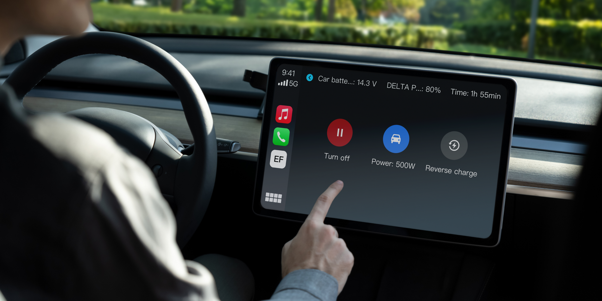Monitor your power station and remaining charging time at a glance. Stay connected with real-time control through Apple iOS CarPlay & Android Auto support. Access the EcoFlow App directly via your vehicle's infotainment system, turning your drive into a hub of intelligent energy management. Everything at your fingertips without constantly checking your phone, ensuring safer driving.