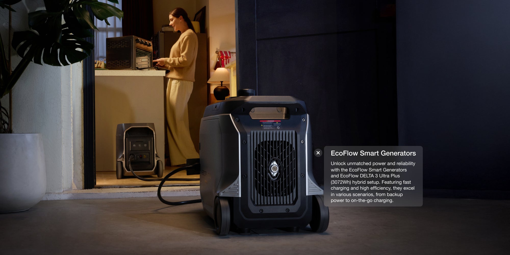 Pair DELTA 3 Ultra Plus (3072Wh) with an EcoFlow Smart Generator [6] to achieve longer runtime—automatically switching between fuel and battery to keep you powered through multi-day outages or off-grid adventure.