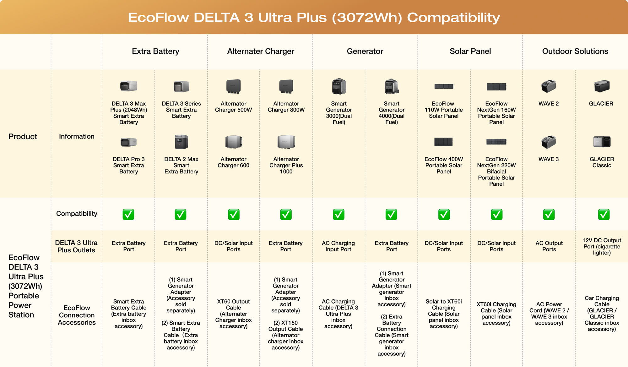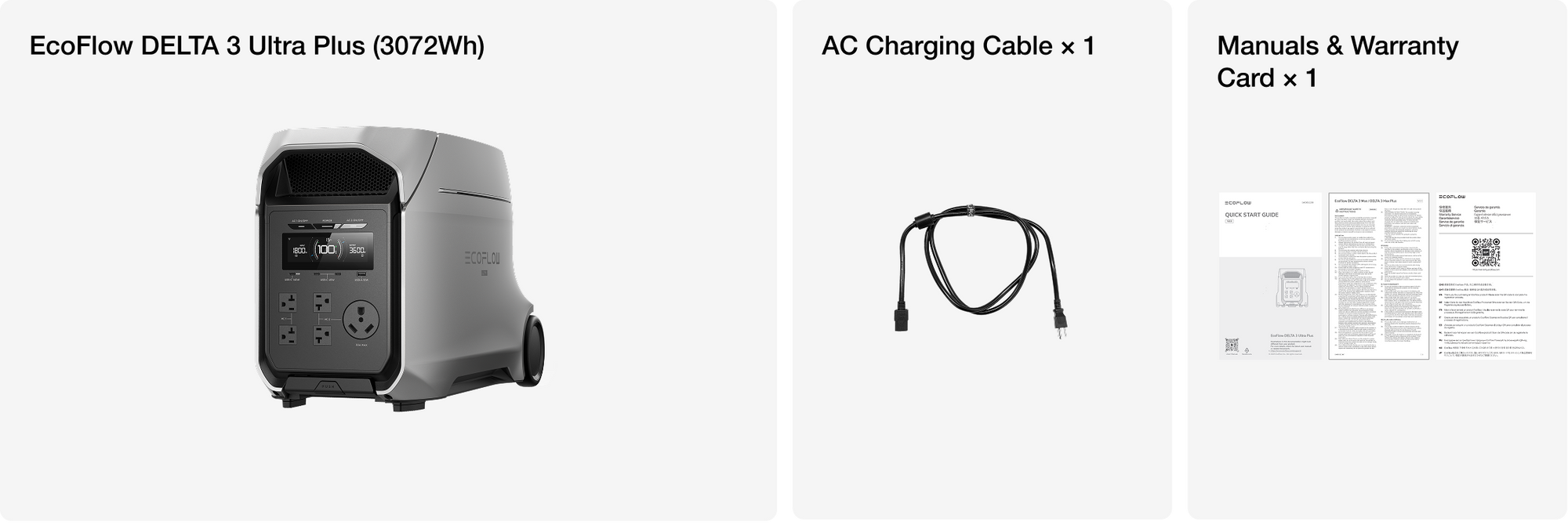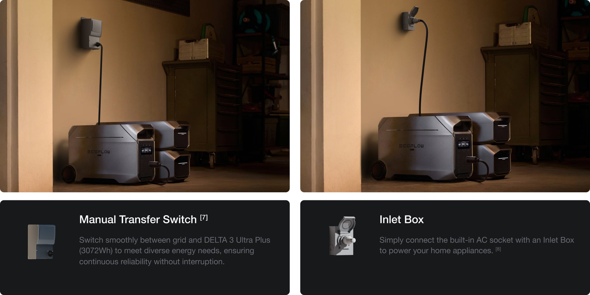 [4] Require connecting 1*DELTA 3 Ultra Plus (3072Wh) + 2* DELTA 3 Max Plus Smart Extra Battery with EcoFlow Smart Extra Battery Expansion Adapter. The EcoFlow Extra Battery Expansion Adapter will be released soon.