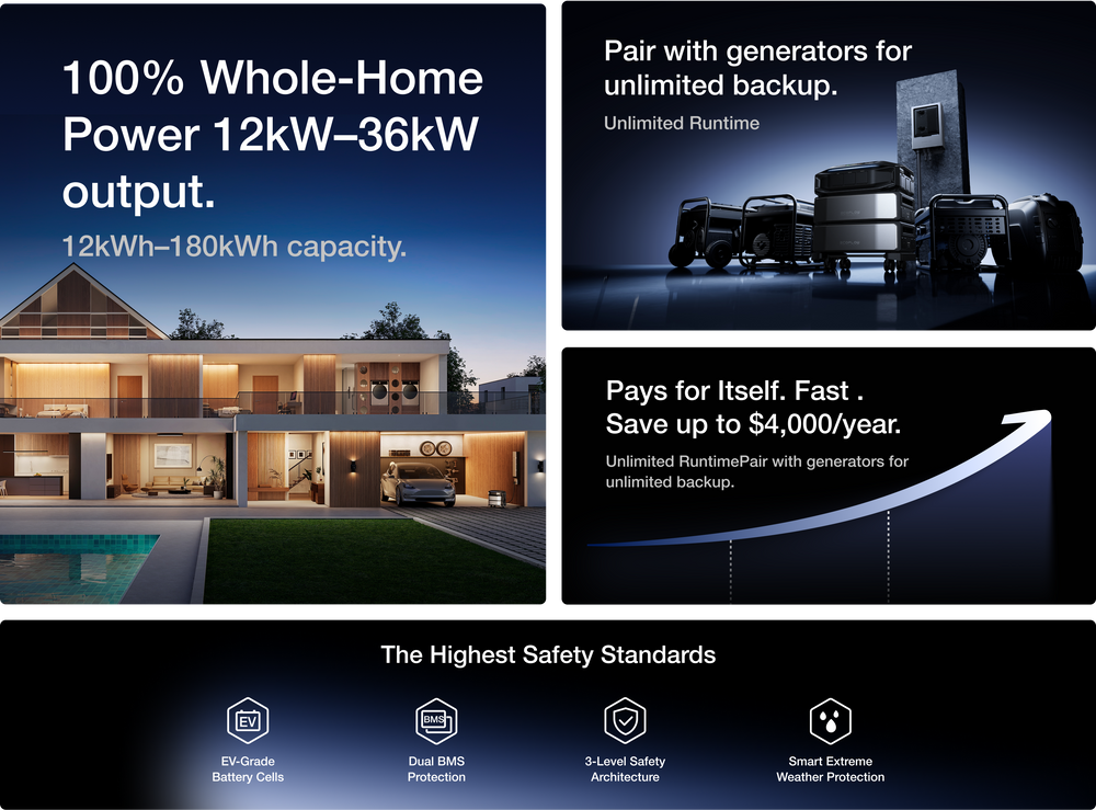 ·100% Whole-Home Power Station: Delivers 12–36kW output and 12–180kWh capacity.