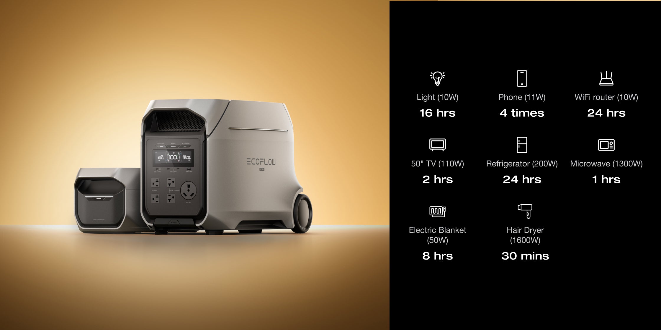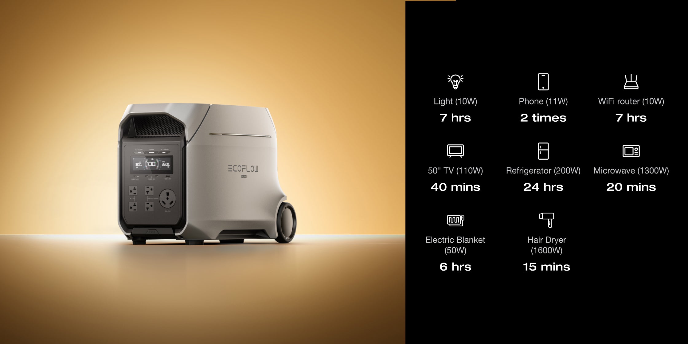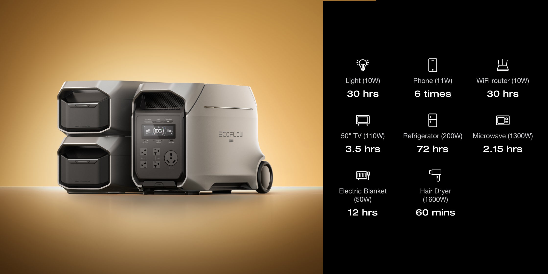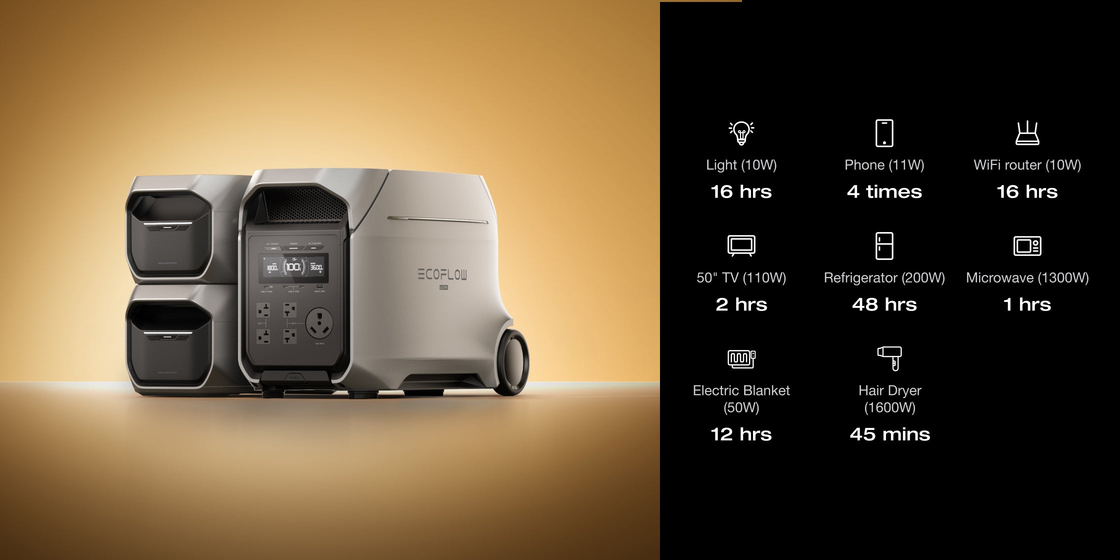 [5] Require connecting 1*DELTA 3 Ultra Plus (3072Wh) + 2* DELTA Pro 3 Smart Extra Battery with EcoFlow Smart Extra Battery Expansion Adapter. The EcoFlow Extra Battery Expansion Adapter will be released soon.