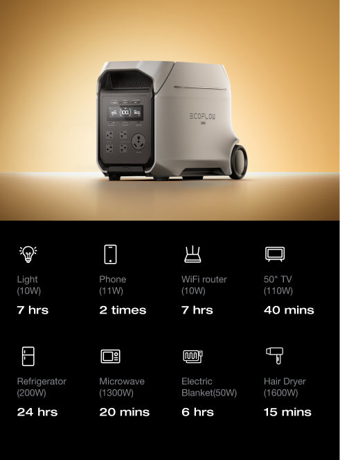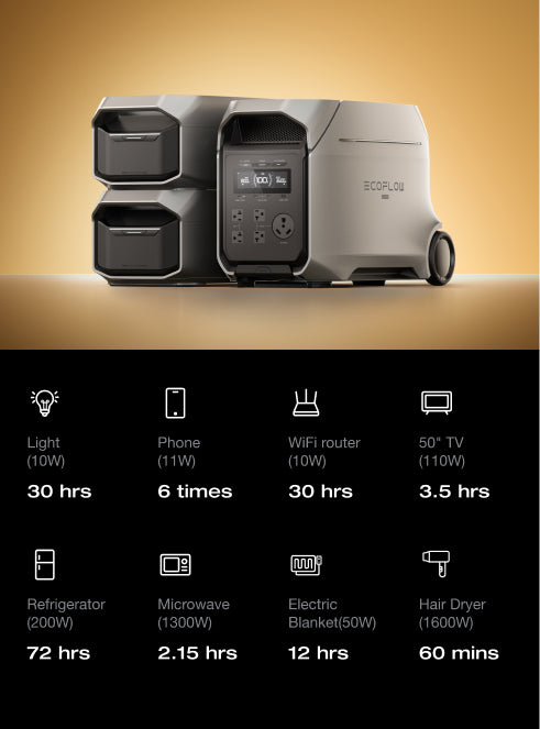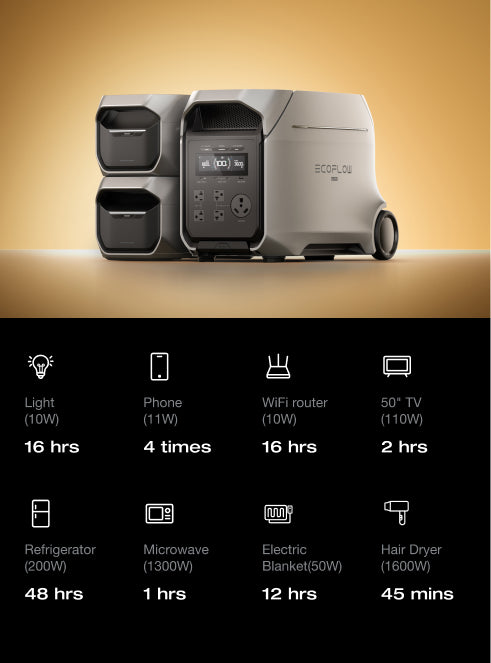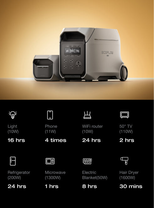 [4] Require connecting 1*DELTA 3 Ultra Plus (3072Wh) + 2* DELTA 3 Max Plus Smart Extra Battery with EcoFlow Smart Extra Battery Expansion Adapter. The EcoFlow Extra Battery Expansion Adapter will be released soon.