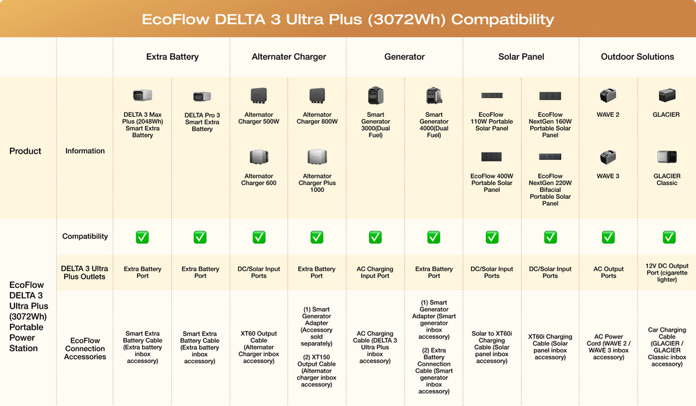 [20] *DELTA 3 Ultra Plus works with:DELTA 3 Max Plus Smart Extra Battery, DELTA Pro 3 Smart Extra Battery, EcoFlow 800W Alternator Charger, EcoFlow Alternator Charger 600, EcoFlow Alternator Charger Plus 1000.