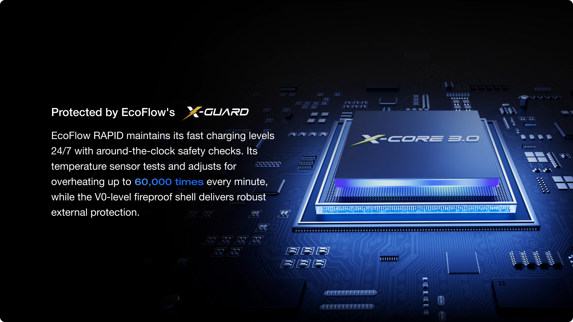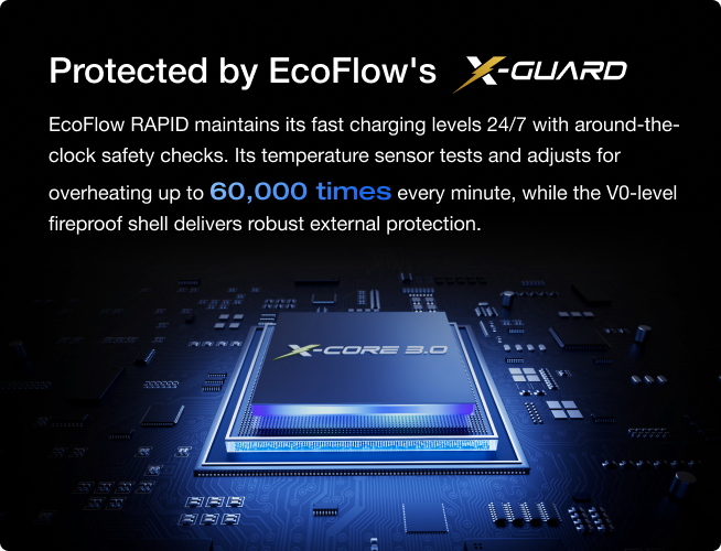 EcoFlow RAPID maintains its fast charging levels 24/7 with around-the-clock safety checks. Its temperature sensor tests and adjusts for overheating up to 60,000 timesevery minute, while the V0-level fireproof shell delivers robust external protection.