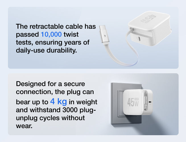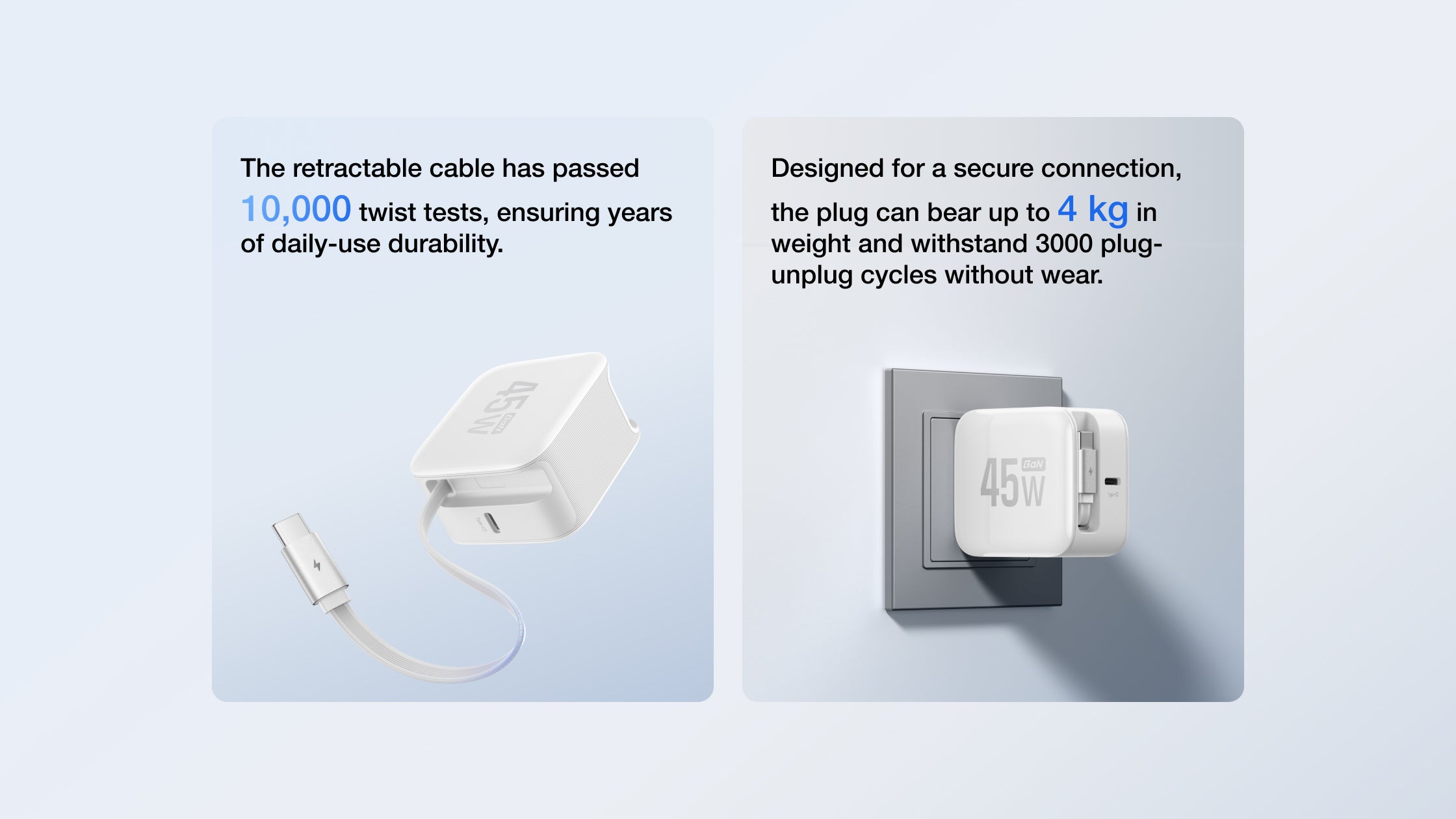Designed for a secure connection, the plug went through 4kg weight bearance tests and 3000-time plug and unplug tests without damage.The retractable cable has passed a 10,000-time twisting test, ensuring years of daily-use durability.