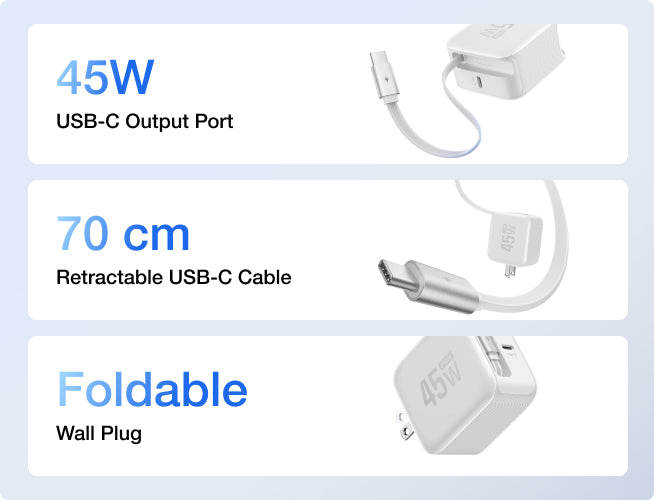 The 65W model measures 52.5 × 51 × 51.3mm and the 45W model measures 61 × 55 × 35.2mm.Both models feature foldable plug designs for easy portability, making them suitable for daily commuting or business travel.