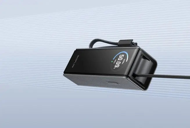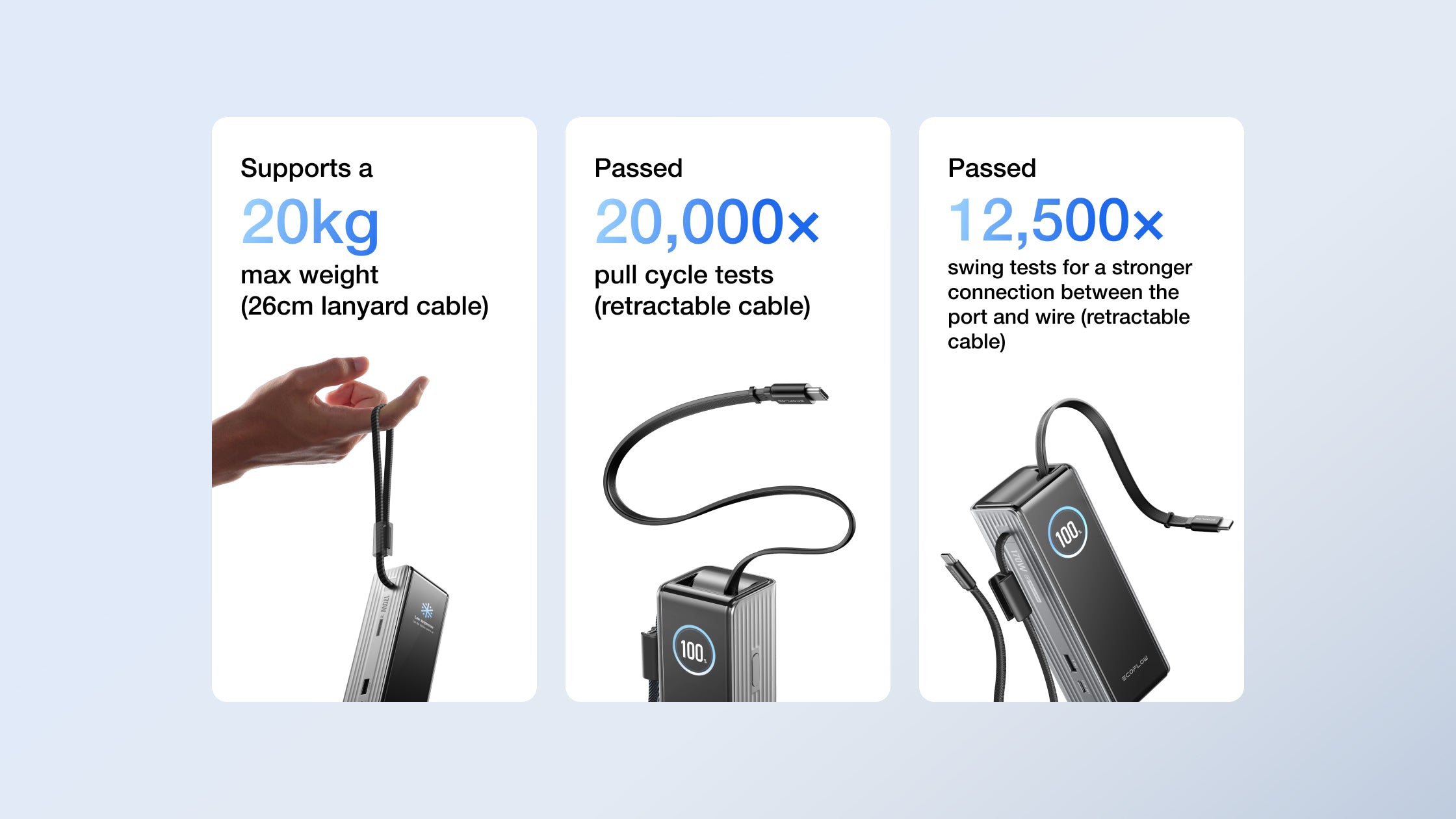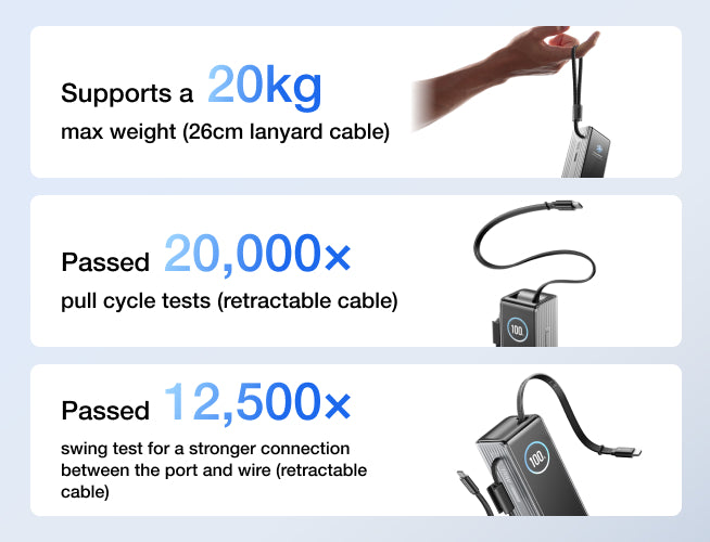 No more lost cables—the 100W built-in USB-C retractable and lanyard cables are always there, tucked neatly into the power bank's sleek design, with a retractable mechanism that lets you access power in seconds.