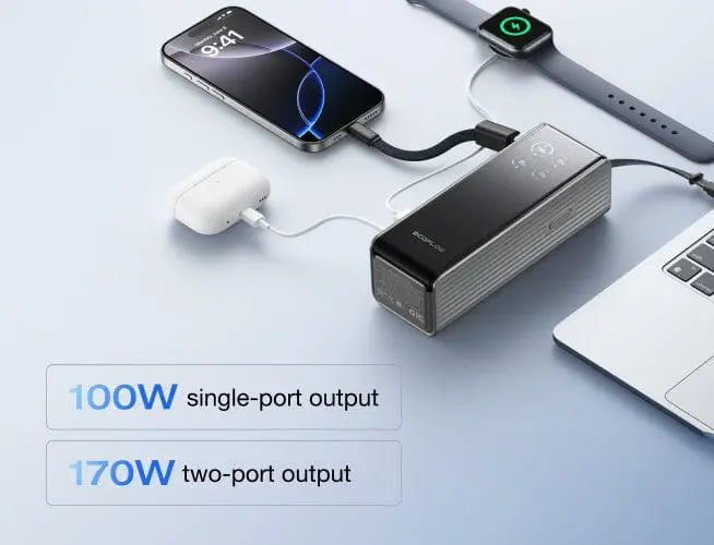 When devices need power, it gets a maximum 100W boost through the USB-C port. With smart distribution, it can deliver power across your laptop, phone, tablet, and earbuds—four devices all at the same time.