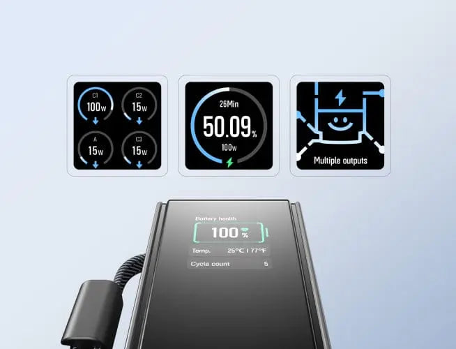 Enhance your charging experience with an intelligent power display. You can view your real-time capacity, port power, battery health, temperature, charging cycles,emojis, and more. The crystal-clear TFT display screen lets you check your data at any angle, in any lighting condition.