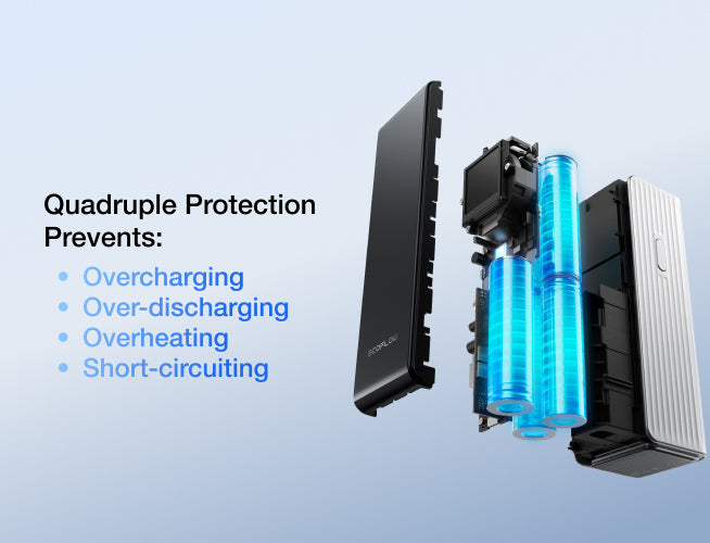 Features pro-grade battery technology found in electric car batteries. EcoFlow RAPID's Battery Management System continuously monitors the charging process with quadruple protection to prevent overcharging, over-discharging, overheating, and short circuiting, ensuring safe and stable operation.