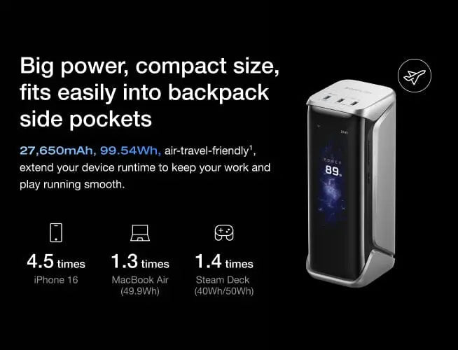 Yes, according to regulations by the International Civil Aviation Organization (ICAO) and most airlines, carrying a power bank with a capacity under 100Wh is allowed. The RAPID Pro, with a capacity of 27650mAh (99.54Wh), meets this requirement and can be carried on board without concern.
