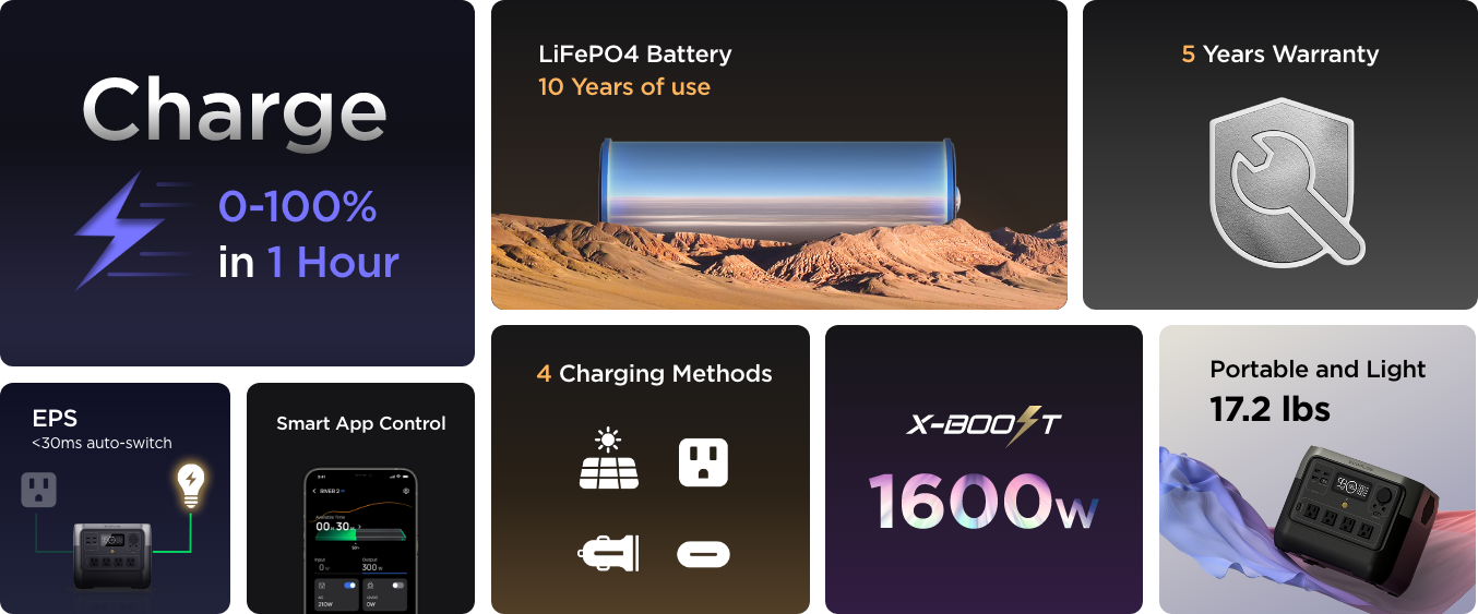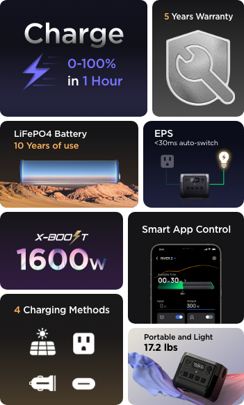 With upgraded long-lasting LFP battery chemistry at its core, charge and empty RIVER 2 Series over 3000 times. That's pretty much 10 years of everyday use[1] and 6x longer than the industry average. With LFP cells, RIVER 2 Series is safe, durable, and highly efficient, even in warm temperatures.